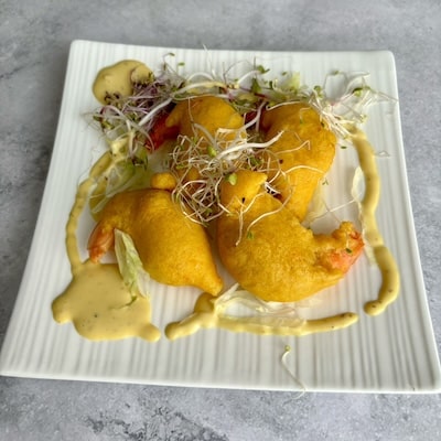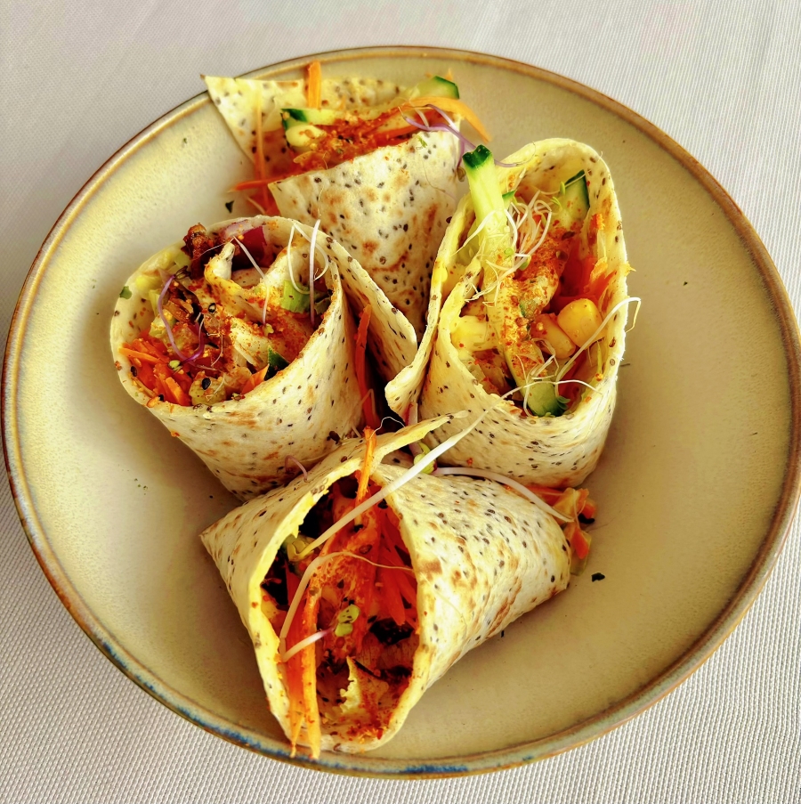 Crispy Peking duck fillet in an original wrap with honey mustard sauce, lettuce, carrot, cucumber, red onion, corn, shiitake, Shichimi Togarashi.