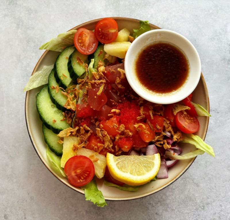 White sushi rice, a marriage of salmon and ahi tuna, dotted with masago, creamy sesame & citrus sauce mix, cherry tomatoes, cucumber, lettuce, pineapple, red bell pepper, red onion, fried onion