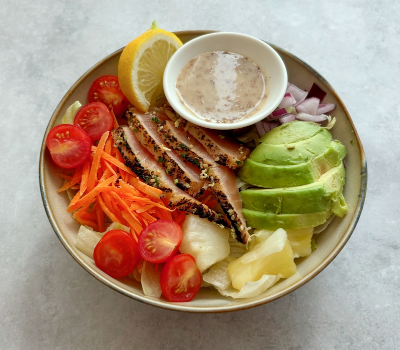 White sushi rice, flamed salmon, creamy sesame sauce, avocado, carrots, cherry tomato, edamame, lettuce, pineapple, red onion