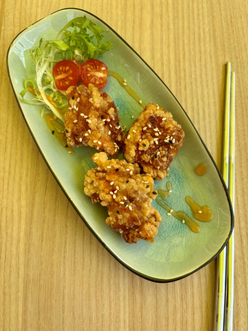 Karaage is a Japanese-style crispy fried chicken, marinated in soy sauce, garlic, and ginger, then coated in potato starch for an extra crunchy texture. It's juicy inside, golden-brown outside.