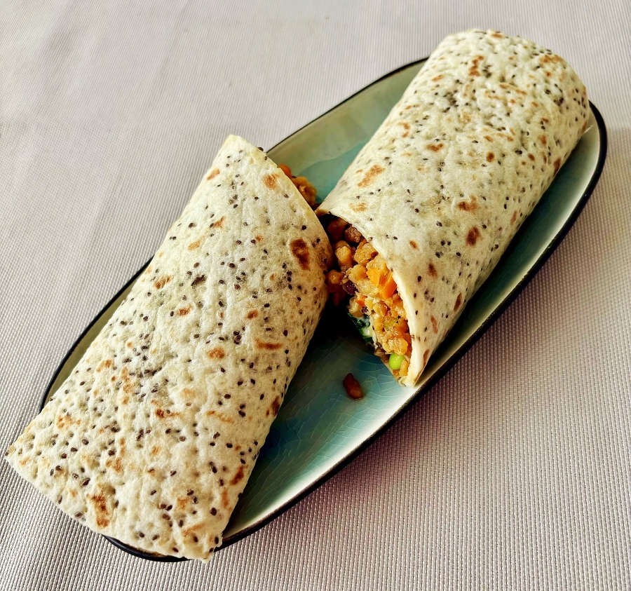 Stir-fried minced beef & pig meat, Japanese mayo, edamame, carrot, cucumber, red onion, corn, shiitake, sesame seeds mix in an original wrap.