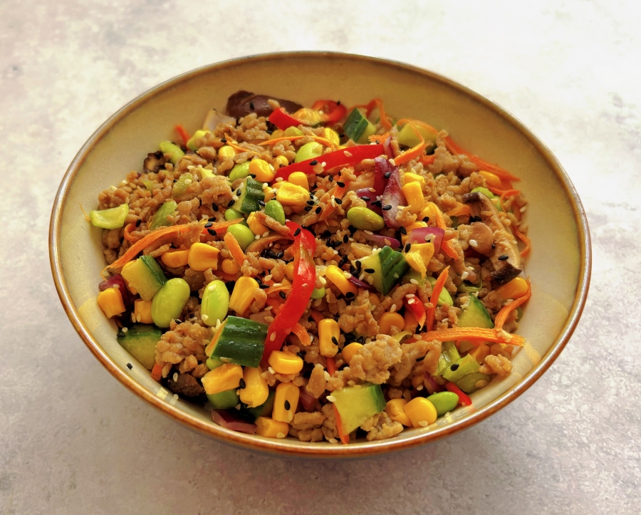 White sushi rice, stir-fried minced beef >50% & pig meat, edamame, carrot, cucumber, red onion, corn, shiitake, sesame seeds mix