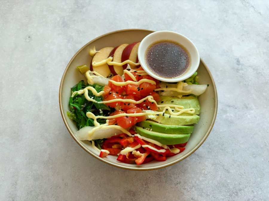 White sushi rice, salmon, wasabi & citrus sauce + Japanese mayo, avocado, edamame, mango, red bell pepper, pickled white radish, seaweed salad, sesame seeds mix.