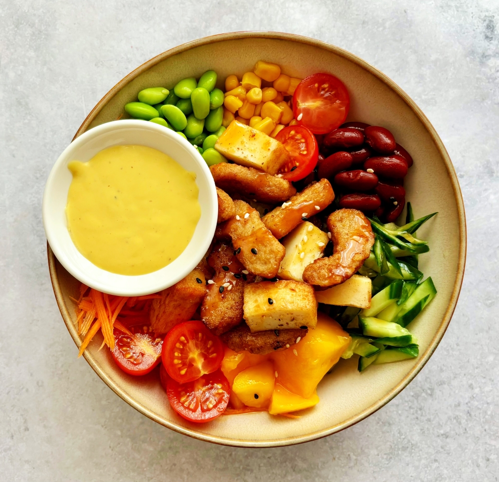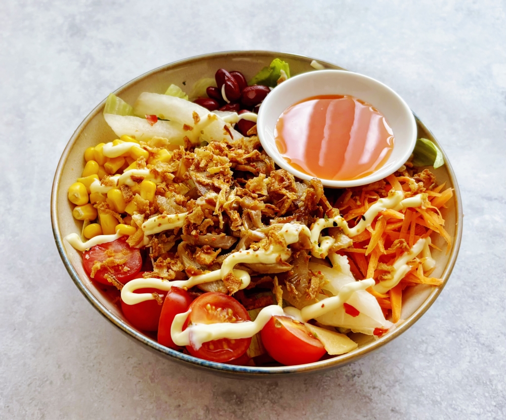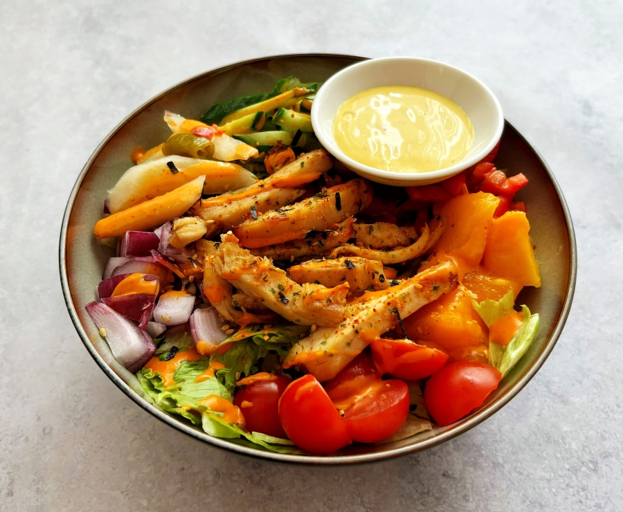 White sushi rice, roasted chicken with natural Oriental spiced oil, Sriracha mayo & honey mustard sauce, carrot, corn, Cherry tomato, lettuce, red kidney bean, pickled white radish, furikake mix